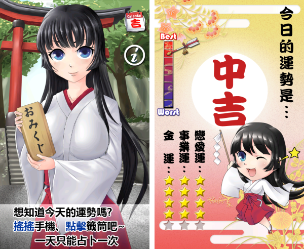 《巫女每日占卜》就是每天都可以幫你算算運勢的占卜小工具。玩法很簡單,就是搖一搖,然後點一下籤筒,畫面中的的巫女就會發揮神秘的力量,用籤占卜大家每天的運勢。新年必備,看看今年運勢怎麼樣就靠這款 APP 了!